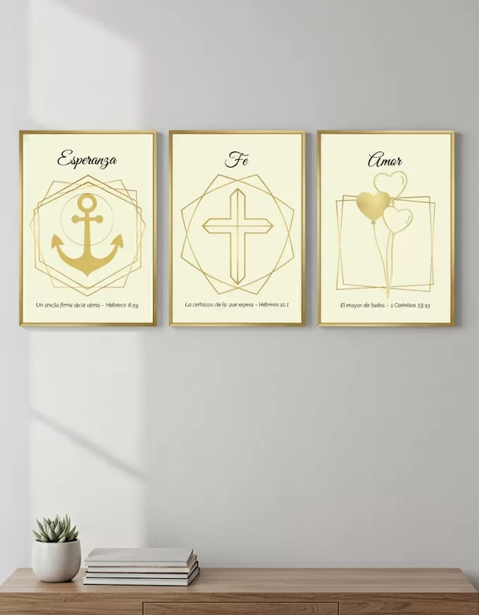 Embellece tu hogar con este Set de 3 cuadros digitales cristianos en alta definición (JPG), inspiradas en el mensaje eterno de Fe – Esperanza – Amor (1 Corintios 13:13). Diseñadas con un estilo moderno y elegante, estas ilustraciones aportan un aire inspirador y lleno de paz a cualquier espacio. Este set no solo es decoración, […]