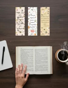 - Tres separadores con versículos bíblicos (Proverbios 2:6, Salmo 119:9, Isaías 40:6) con diseño floral, listos para imprimir y usar. Formato PDF y png tamaño 2″ x 6″ en alta definición 300 ppp.